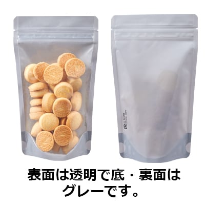 ガスバリア性・静防性のある透明フィルムを使用した表が透明、裏がグレーの袋です。